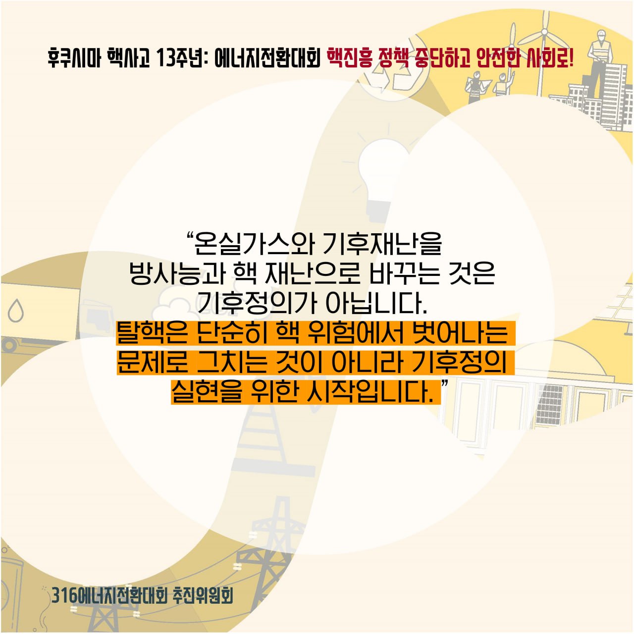 4월 총선과 311 후쿠시마 13주년을 맞아 진행되는 [후쿠시마핵사고13주년:에너지전환대회] 두 번째 목소리를 소개합니다.