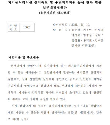 ※ 셋째, 윤준병 의원법안처럼 민간 기업들에게 특혜를 주고 공공의 책임을 포기하는 법안은 즉시 철회하고, 산업폐기물 문제에 대한 공론의 장이 마련되어야 한다. 권역별로 공공처리장을 만드는 방안, 산업폐기물매립장을 하는 기업들이 벌어들이는 막대한 이익을 공적으로 환수하는 방안, 매립을 최소화하고 산업폐기물량을 줄일 수 있는 방안 등이 논의되고 정책으로 만들어져야 한다.