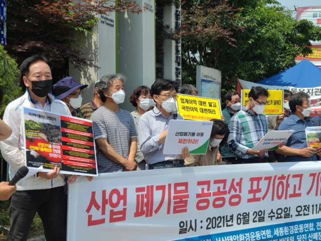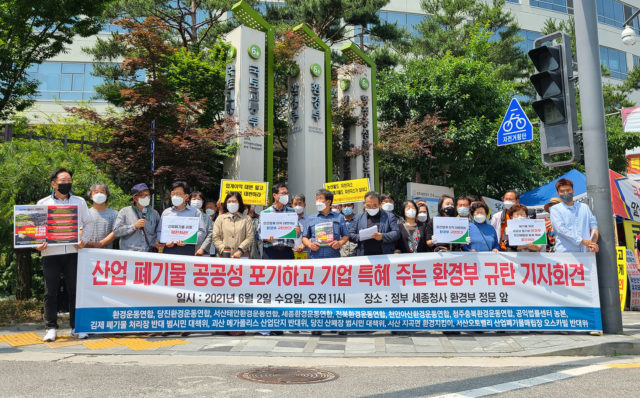 6월 2일, 환경부 앞에서 전국 환경운동연합 및 전국 산업단지 폐기물처리장 대책위원회와 지역 주민들이 산단 내 폐기물 이동제한을 해제하는 환경부의 ‘폐촉법 개정안’을 철회할 것을 요구하는 기자회견을 진행하였다.
