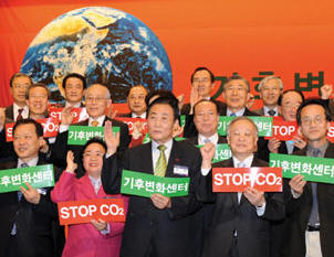 | 온실가스 배출량을 2005년 수준으로 유지하겠다는 정부정책은 사실상 무방비를 선언한 것이나 다름없다. 지난 2월 기후변화센터 창립총회 참가자들이 ‘스톱 이산화탄소’를 외치고 있다. <김세구 기자> |