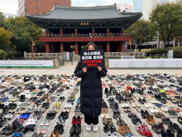 이에 환경운동연합은 <팔레스타인과 연대하는 한국 시민사회 긴급행동>과 함께 17일 오전 9시부터 오후 8시까지, 주한 이스라엘 대사관 인근 보신각 광장에서 <모든 희생자를 애도하는 신발들의 시위 : 이스라엘은 학살을 멈춰라. 팔레스타인에 자유와 평화를!>을 개최했습니다. 75년이 넘는 이스라엘의 점령과 폭력의 역사 동안 팔레스타인 가자 지구와 서안 지구, 이스라엘 등에서 사망한 모든 희생자를 상징하는 신발 2천 켤레를 광장에 설치하여 이스라엘 정부가 학살을 중단하고 즉각 휴전에 응할 것을 촉구했습니다.