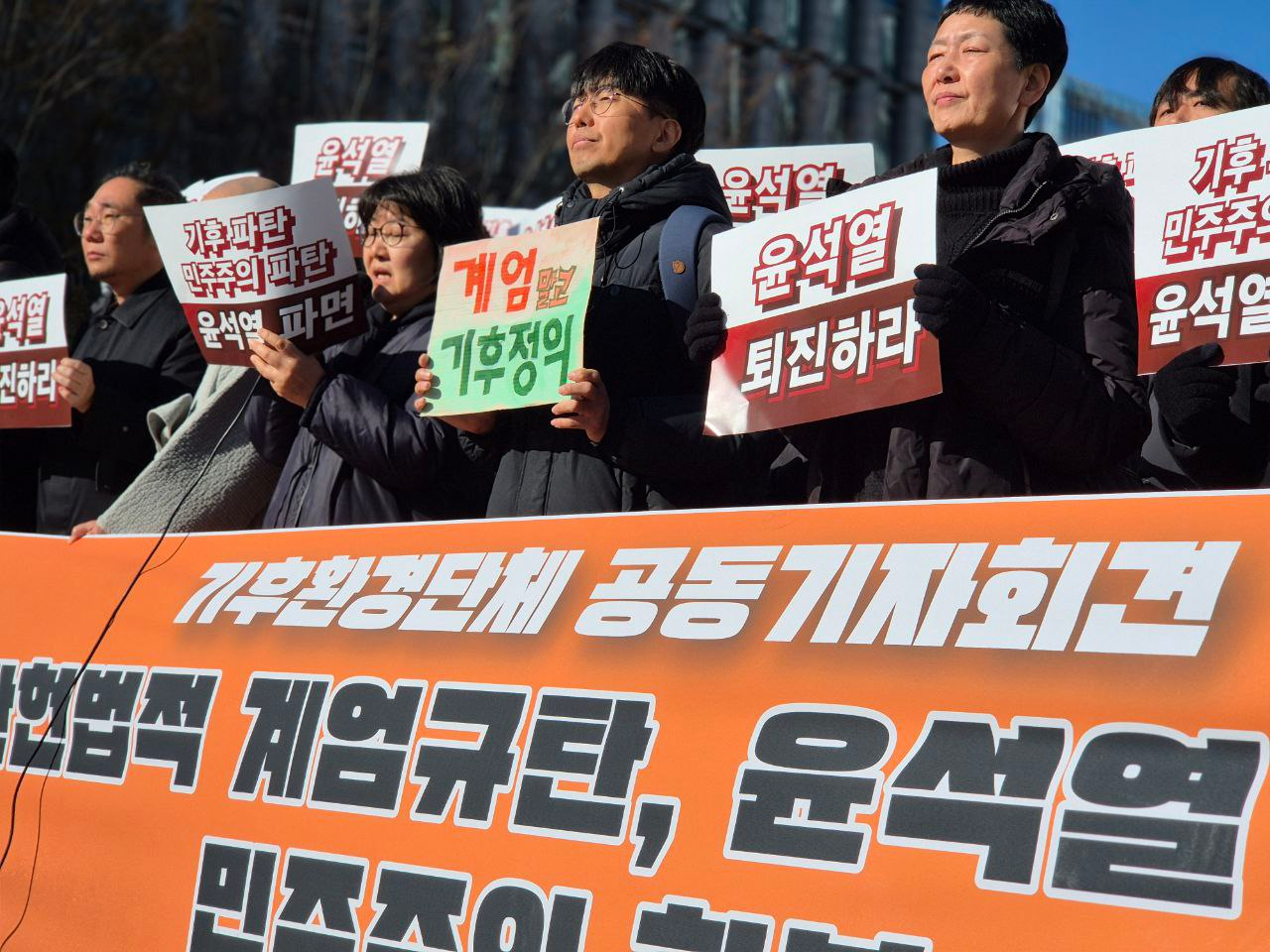 이에 기후위기비상행동, 기후정의동맹, 종교환경회의, 탈핵시민행동, 한국환경회의 등의 기후환경단체들은 4일 긴급 공동기자회견을 갖고 헌정질서를 유린하는 계엄사태는 민주주의를 짓밟는 폭거라며 기후 민생 파탄의 주범 윤석열의 즉각 퇴진을 강력 요구했다.
