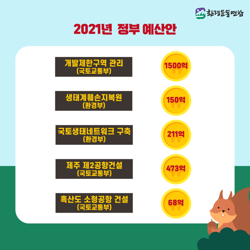 환경부의 국토생태네트워크 구축 예산이 211억원 편성되었고,