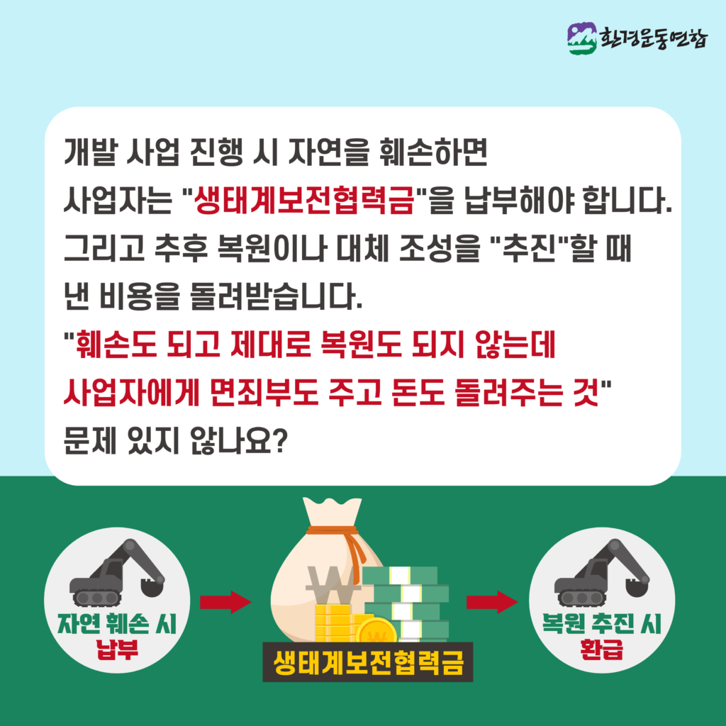 즉, 개발 사업자가 사업을 추진하면서 생태계를 훼손하게 될 시 복원을 위해 생태계보전협력금을 납부해야하구요,