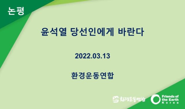 ◯ 윤석열 국민의 힘 후보가 제20대 대통령으로 당선됐다. 대통령은 국민 통합과 미래를 준비해야 하며 심화되고 있는 지구적 위기를 극복해야 하는 책무가 있다. 환경운동연합은 윤석열 후보의 당선을 축하하며 기후위기와 지속가능발전 시대에 기후·환경 대통령으로서 글로벌 리더십 발휘를 요청하고자 한다.