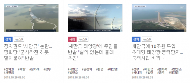 그러자 조선일보는 ‘문재인 정부가 10조 원 들여 만든 간척지를 태양광으로 뒤덮으려 한다’고 목소리를 높였다. 사업 계획 발표되기 하루 전인 29일부터 30일까지 이틀간 8건이나 그런 보도를 냈다. <새만금에 여의도 13배 크기 태양광 시설…청 주도 비공개 추진>, <새만금 태양광 일방통행에 들끓는 전북민심>, <주민에게도 쉬쉬 국책사업 난맥 새만금 태양광에 쏟아진 질타>, <문 대통령 새만금 태양광 선포의 날, 전북의원 8명 반대성명>, <새만금에 세운다는 세계에서 제일 비싼 태양광>, <바다 메워 태양광 패널 깐다는 나라> 등 보도 제목만 봐도 조선일보가 상당히 격양되어 있음을 알 수 있다.