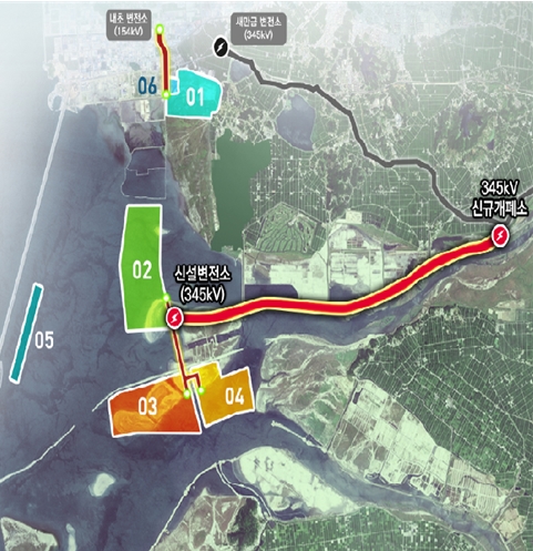 새만금 개발청이 발표한 ‘새만금 재생에너지 클러스터 조성 계획’ 1~4번 지역에 설비용량 2.4GW의 태양광 패널, 5번에는 해상풍력발전소 6번에는 연료전지가 설치된다.(출처 : 새만금개발청)