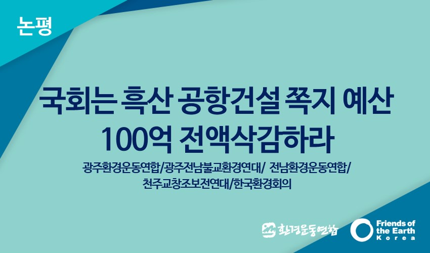 우리는 국회에 국토교통위원회가 의결한 흑산공항 사업비 100억 원의 전액삭감을 강력히 요구한다. 이미 흑산 공항사업은 예산이월과 불용이 되풀이되는 상태다. 잘못된 정책판단과 사업계획 상 심각한 문제가 이유였다. 국회 최종 예산심의를 앞두고 흑산공항 사업비를 삭감하라는 사회적 요구를 수용해야 한다.