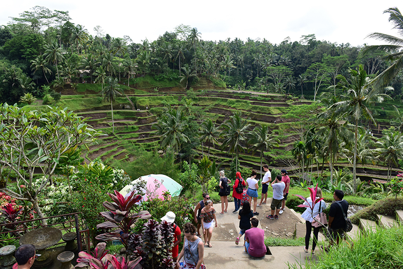 발리의 농경체계인 수박(subak)의 계단식 논. 유네스코 세계유산으로 지정 이후 많은 관광객들이 찾아오고 있다 (2018년 1월 6일 필자 촬영).