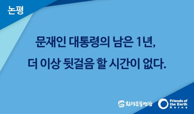 묻지 않을 수 없다. 문 대통령은 남은 1년동안 무엇을 할것인가. 기회는 평등하고, 과정은 공정하며 결과는 정의로울 것이다. 대통령의 국정운영 철학을 담은 캐치프레이즈에 환경위기는 예외인가? 우리는 촛불혁명이 만들어낸 결실과 희망을 보고싶다.