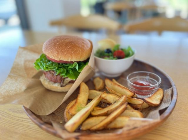 비건 카페 칠분의 오에서 이번에는 버거 플레이트를 맛보았다. 패티도 두툼하고 버거 안에 들어간 버섯도 맛났다. 감자튀김과 샐러드가 함께 나와서 여행 중 허기질 때 배를 채우기 좋은 음식이었다.