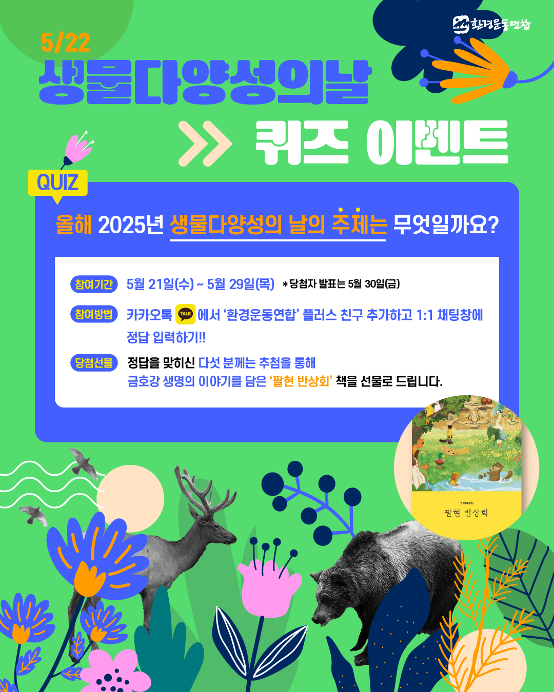 그렇다면, 2025년의 주제는 무엇일까요? 지금 바로 퀴즈에 참여하세요! 정답을 맞히신 분들 중 추첨을 통해 금호강 생명의 이야기를 담은 '팔현 반상회'를 보내드립니다!