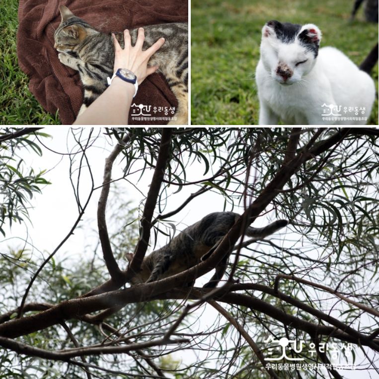 라나이 캣 생츄어리 보호소에서 만난 고양이들. 위 오른쪽은 화상입은 고양이© 박나윤 우리동생 조합원