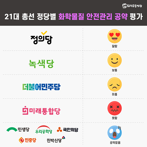 ※ 더 보기 : [보도자료] 총선 화학물질 관련 공약, 정의당 ‘진취적’•민주당 ‘반쪽 공약’•미래통합당 ‘안전 위협’