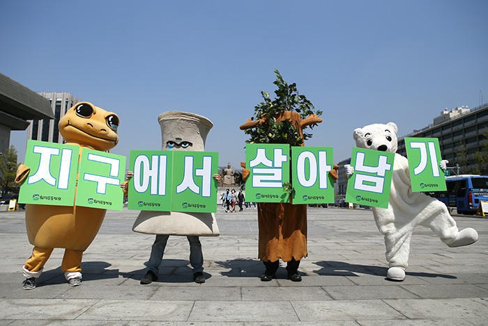 ◯ 14일 총선을 하루 앞두고 환경운동연합이 광화문광장에서 ‘4.15투표로 지구에서 살아남기’ 퍼포먼스를 벌였다. 퍼포먼스에는 북극곰, 원자력발전소, 도롱뇽, 나무가 등장해 각각 ‘기후위기’, ‘에너지전환’, ‘생태계보전’, ‘도시공원’을 위해서 투표해달라고 시민들에게 호소했다.