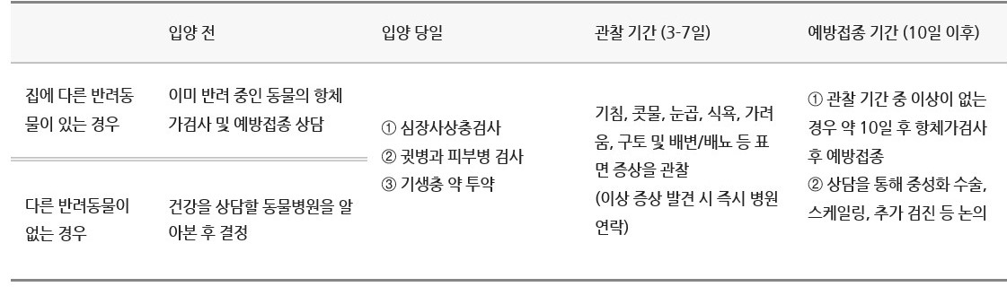 특히 집에 다른 반려동물이 있을 경우 피부병이나 호흡기 질환의 전이뿐만이 아니라 치사율 높은 바이러스 감염증을 유발할 수 있으므로 입양 전 반려 중인 동물의 항체가 여부 검사 후 결과에 따라 예방접종을 하도록 합니다. 입양 시 사용한 이동장 세척과 소독도 필수입니다.