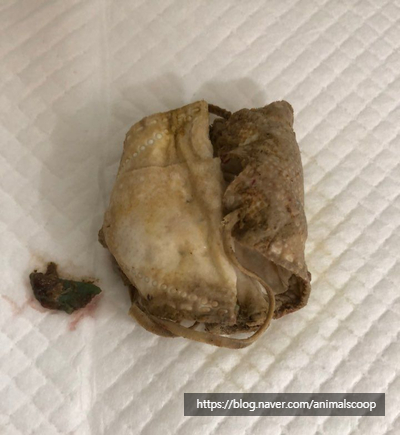 아침에 먹은 개껌 등과 함께 놀랍게도 엑스레이에서 확인했던 철사의 정체는 바로 일회용 마스크였습니다. 마스크의 천은 엑스레이를 통한 확인이 불가하기 때문에 코 부분을 지지하는 철사가 구불구불하게 접혀 있던 것만 확인되었던 것입니다. 돌돌 말아 산책로에 버려진 마스크를 율무가 삼킨 것으로, 보호자는 삼킨 것이 마스크일 것은 상상조차 못했다고 합니다. 다행히 율무의 상태가 나쁘지 않아서 보호자에게 주의사항을 당부 드리며, 율무는 3일 입원 후 퇴원했습니다.