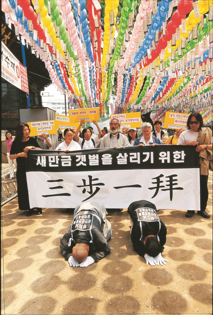 2001년 5월 수경스님과 문규현 신부는 조계사를 출발해 청와대까지 새만금 갯벌을 살리기 위한 염원을 담아 삼보일배를 진행했다. ⓒ함께사는길