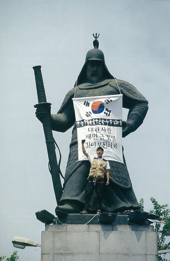 2001년 5월 황화문 이순신 동상에 환경운동연합 ‘생명의빛’ 단원들이 올라 이순신장군이 생명을 바쳐 지킨 바다와 갯벌을 후손들이 망치지 말라는 액션을 펼쳤다.ⓒ함께사는길
