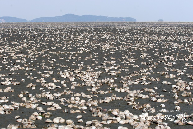 새만금 방조제 물막이 완료 이후 조개들이 집단 폐사한 모습 Ⓒ주용기