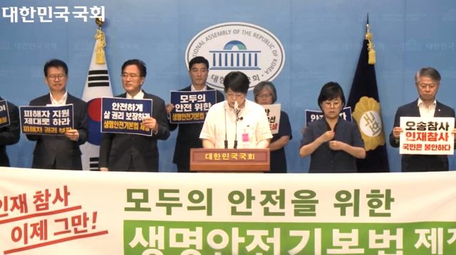 27일 생명안전기본법 제정을 위한 참사 피해자들과 시민사회단체 연대기구인 ‘생명안전기본법 제정을 위한 시민동행’과 ’국회 생명안전포럼‘은 국회 소통관에서 오송 지하차도 참사 등 수해 재난에 대해 공동 기자회견을 개최했습니다. 기자회견에서는 오송 지하차도참사가 명백한 인재임을 밝히고, 형사처벌 중심의 조사의 문제점과 반복되는 후진적 인재 참사에 대한 근본적 재발방지 대책으로서 생명안전기본법 제정의 필요성을 제시했습니다.