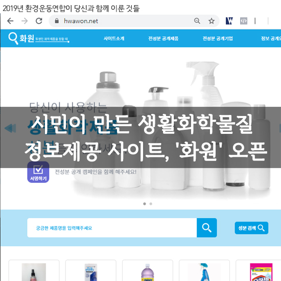 이러한 자료들을 모아 시민이 만든 생활화학제품 정보 사이트 ‘화원’이 오픈되었습니다. ‘화원’은 방대한 양의 생활화학제품들의 전성분 공개와 함께 아직 성분이 공개되지 않은 제품들을 기업에 직접 요구하는 시민 캠페인 활동을 제공하고 있습니다. 향후 생활화학제품의 안전한 사용과 같은 정보들이 추가될 계획입니다.