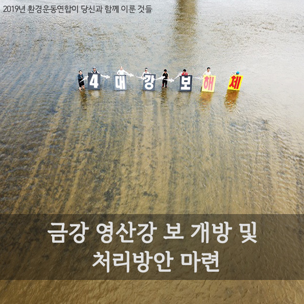 환경운동연합은 환경부 산하에 구성된 4대강 자연성 회복을 위한 조사평가단에 참여해 적극적으로 정책을 제안하고 있으며, 앞으로도 한강, 낙동강의 수문개방과 우리 강의 자연성 회복을 위해 현장 곳곳에서 끊임없이 활동을 이어가겠습니다.