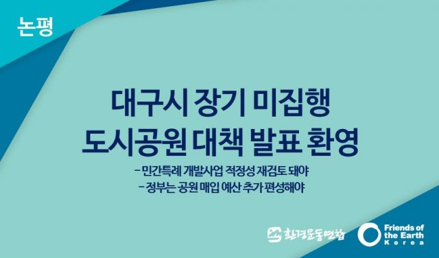 아울러 이번 대책에 포함되지 못한 15개소의 장기미집행 도시공원에 대한 계획도 조속한 시일 내에 발표되기를 바란다. 혈세낭비 논란이 있는 개발 사업은 멈추고 공원 매입 예산을 늘여나가는 정책 기조를 지속적으로 이어가길 바란다. 또한 민간특례로 진행 중인 수성구 대구대공원, 달서구 갈산공원, 북구 구수산공원의 경우에는 그 적정성에 대해 재검토해서 개발 비율을 최소화 하고 자연성을 최대한 살리는 방향으로 진행되길 촉구한다.