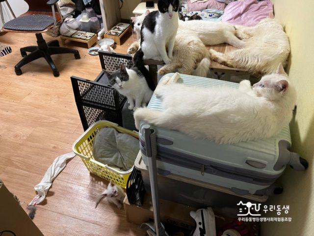 2021년 개입했던 애니멀호딩 가구. 고시원 1인실에 40마리 가량의 고양이가 살고 있었습니다. 애니멀호더는 고양이 전수 사육포기를 했으며 심리상담도 진행하였으며, 정신건강복지센터를 통한 전화상담도 진행하였습니다. 고양이들은 필요한 치료 및 중성화수술 후 다양한 쉼터로 분산되어 이동하였고, 일부는 입양이 이뤄졌습니다. 반려인은 고양이에게 속죄하는 의미로 6개월 이상 거주 지역의 고양이쉼터에서 봉사활동을 하고 있고, 쉼터의 모니터링 하에 다시 고양이를 양육하지 않는 약속을 지키고 있습니다.