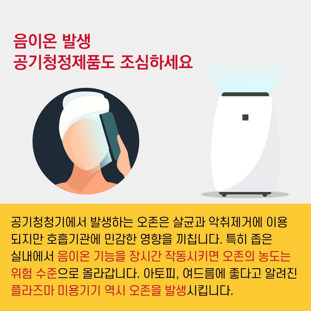 공기청청기에서 발생하는 오존은 살균과 악취제거에 이용 되지만 호흡기관에 민감한 영향을 끼칩니다. 특히 좁은 실내에서 음이온 기능을 장시간 작동시키면 오존의 농도는 위험 수준으로 올라갑니다. 아토피, 여드름에 좋다고 알려진 플라즈마 미용기기 역시 오존을 발생시킵니다.