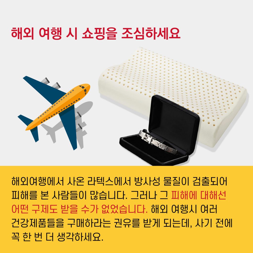해외여행에서 사온 라텍스에서 방사성 물질이 검출되어 피해를 본 사람들이 많습니다. 그러나 그 피해에 대해선 어떤 구제도 받을 수가 없었습니다. 해외 여행시 여러 건강제품들을 구매하라는 권유를 받게 되는데, 사기 전에 꼭 한 번 더 생각하세요.