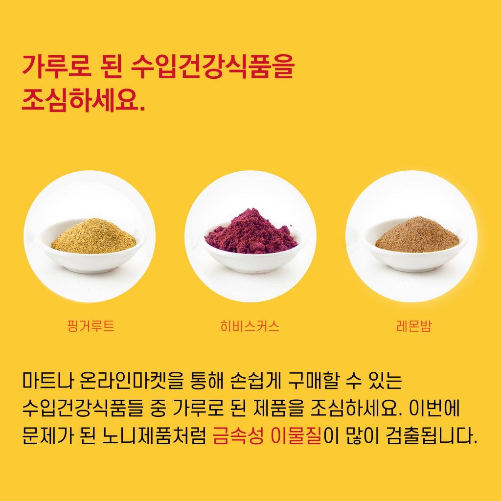 마트나 온라인마켓을 통해 손쉽게 구매할 수 있는 수입건강식품들 중 가루로 된 제품을 조심하세요. 이번에 문제가 된 노니제품처럼 금속성 이물질이 많이 검출됩니다.(핑거루트, 레몬밤, 히비스커스 등등)