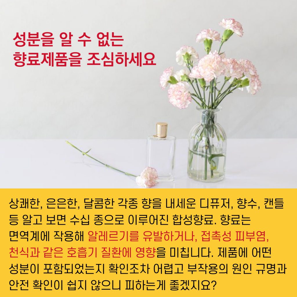 상쾌한, 은은한, 달콤한 각종 향을 내세운 디퓨저, 향수, 캔들 등 알고 보면 수십 종으로 이루어진 합성향료. 향료는 면역계에 작용해 알레르기를 유발하거나, 접촉성 피부염, 천식과 같은 호흡기 질환에 영향을 미칩니다. 제품에 어떤 성분이 포함되었는지 확인조차 어렵고 부작용의 원인 규명과 안전 확인이 쉽지 않으니 피하는게 좋겠지요?