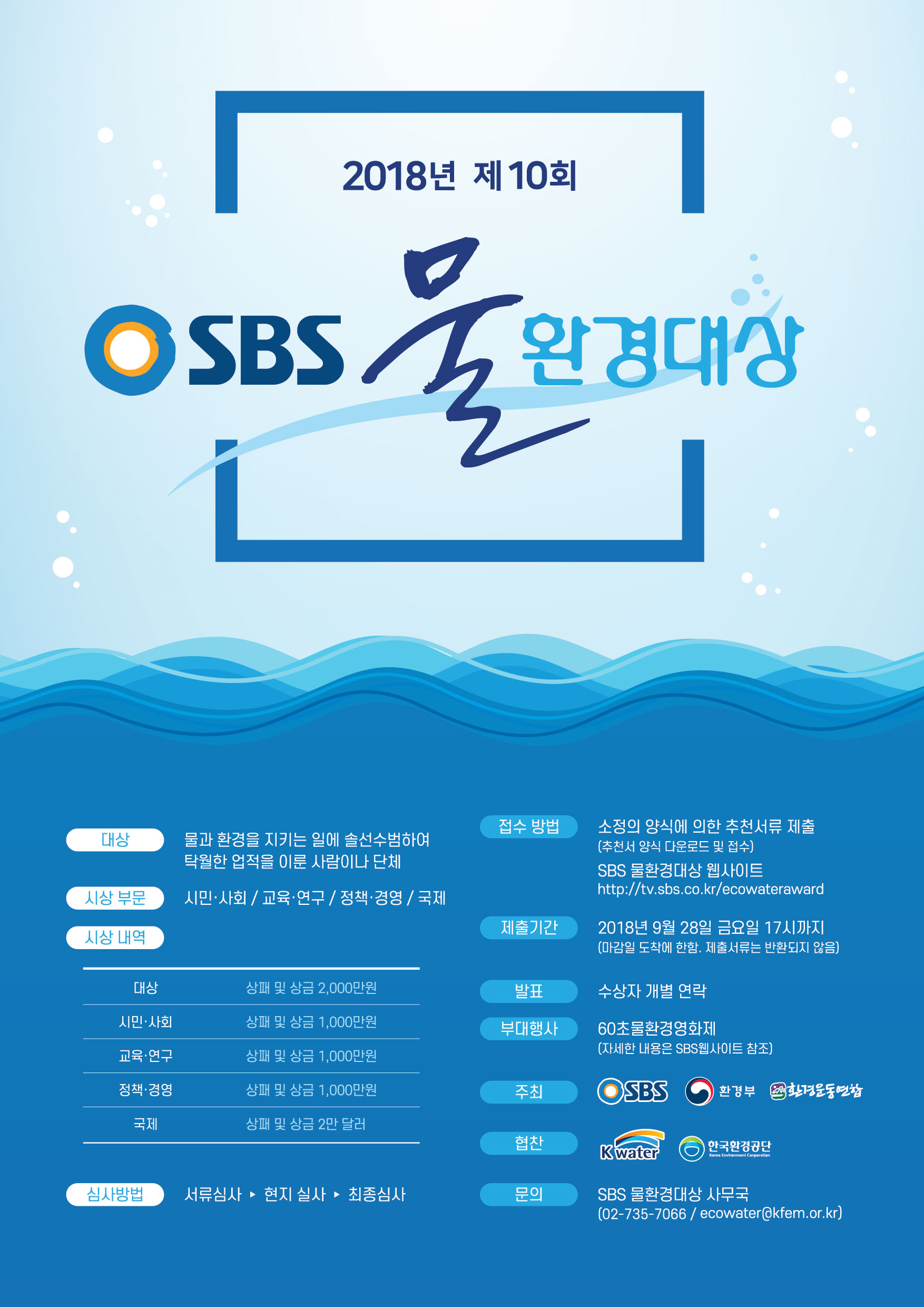물과 생태환경의 소중함을 알리기 위한 ‘2018 SBS 물환경대상’ 시상식을 진행합니다. ‘2018 SBS 물환경대상’은 지구촌의 물과 생태환경을 지키고자 애쓰는 사람과 단체를 격려하기 위해 제정된 상입니다. 올해로 10회째를 맞이한 ‘2018 SBS물환경대상’은 대상 외 시민‧사회 / 교육‧연구 / 정책‧경영 / 국제 등 4개 부문으로 나누어 시상합니다. 각 부문에 탁월한 업적을 보이신 분이나 단체의 적극적인 추천과 참여를 바랍니다.