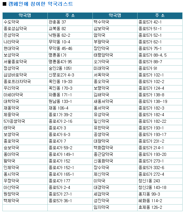 5월 3일부터 서울환경연합은 종로구보건소와 종로구약사회 공동으로 종로5가에 위치한 60여 곳의 약국을 중심으로 ‘의약품의 올바른 재사용과 폐의약품 수거 캠페인’을 진행하고 있다. 작년에 이어 올해 진행되는 캠페인은 약국 중심의 폐의약품 분리수거뿐만 아니라 가정에 오래 방치된 의약품을 약사가 식별하여 올바른 재사용과 보관법도 지도한다. 또한 약국 협조로 수거된 폐의약품들을 분류하여 많이 버리고 있는 의약품 종류를 발표할 계획이다.