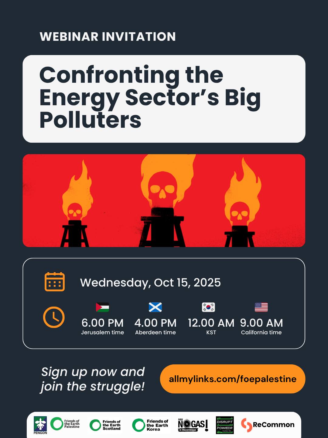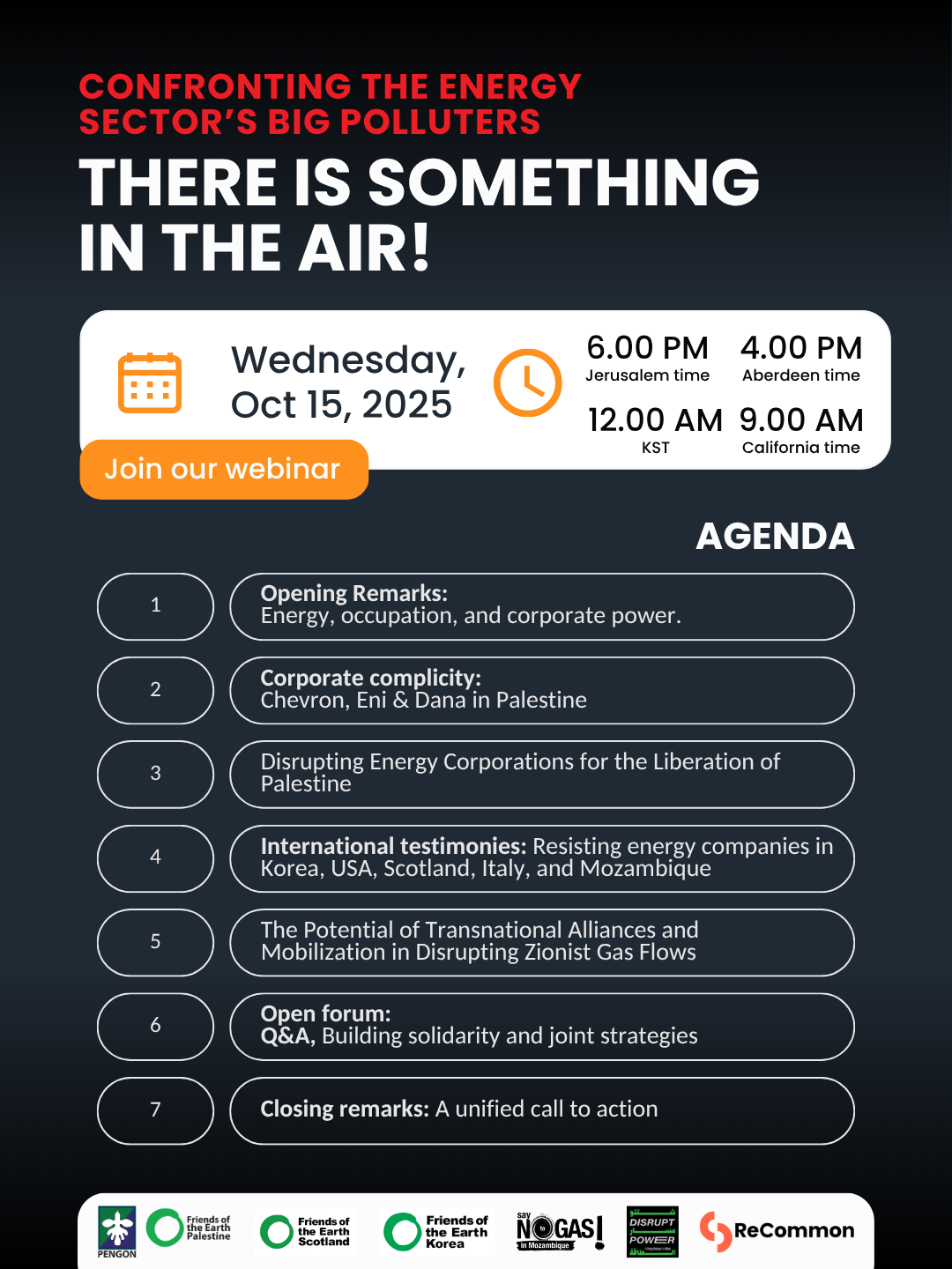 팔레스타인에서의 환경 정의를 위한 투쟁은 점령과 기업의 공모에 맞서는 싸움과 분리될 수 없습니다. 이번 웨비나는 쉐브론(Chevron), 에니(Eni), 다나 페트롤리엄(Dana Petroleum)과 같은 주요 에너지 기업들이 어떻게 팔레스타인의 천연자원을 착취하며 이스라엘의 점령과 아파르트헤이트 체제를 강화하고 있는지를 폭로합니다.