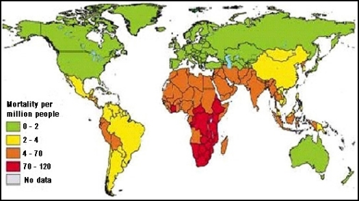 A great number of the African population suffers from hunger and extreme poverty. Climate change therefore poses a threat against the on-going actions and fight for the eradication of extreme poverty and hunger on the continent. The effects of climate change will make it impossible to achieve the Millennium Development Goals (MDGs) and also poses a major threat to sustainable growth and development of the continent. Africa is particularly threatenedby visible effects such as spreading diseases, worsening food security, reduced agricultural production, the increased incidence of both flooding anddrought, and an increased risk of conflict over scarce land and water resources. The World Health Organization (WHO) noted that Africa bears the effect of an approximate 150,000 deaths per year that occur globally because of climate change. These figures will more than likely double by 2030. The disproportion between those who contribute to global warming and those that suffer from it is stark. Figure 1 illustrates this disparity.