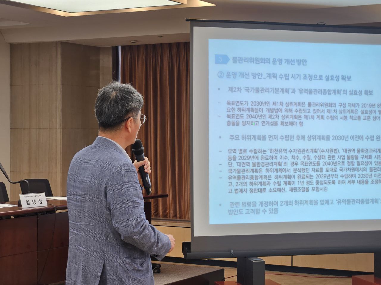 염형철 대표는 과거 우리 물 정책의 흐름이 자연성 회복으로 꾸준히 이동해왔음에도 불구하고, 4대강 사업이 이를 되돌려 놓았다고 보고 보 해체를 통한 복원을 넘어 전국적 난개발과 공유지 사유화 문제도 함께 바로잡아야 한다고 지적했다. 또한 염형철 대표는 물관리일원화의 현 상황에 대해 후회한 부분이 있다고 얘기했다. 염형철 대표는 “계획 수립도, 개발도, 평가도 환경부가 하는, 충분한 안전 장치가 없는 지금과 같은 상태에서는 물관리일원화의 2단계는 곤란하다.”라며 현 물관리일원화 체제에 대한 우려를 전했다. 이어 국가물관리위원회에 대해서는 위원회의 위상은 제도만이 아니라 구성원들의 투쟁과 책임으로 세워야 한다고 강조하며, 체계 정비와 예산의 확보도 중요하지만 위원회의 구성원이 될 사람들이 치열하게 고민하고 논의하는 것이 무엇보다 중요하다고 강조했다. 이를 통해 4대강 자연성 회복, 하천 관리 전화 등의 정책도 “환경부한테 해라 해라라고 요구하는 것이 아니라 할 수밖에 없도록 만들어야 된다고 생각한다”고 전했다.
