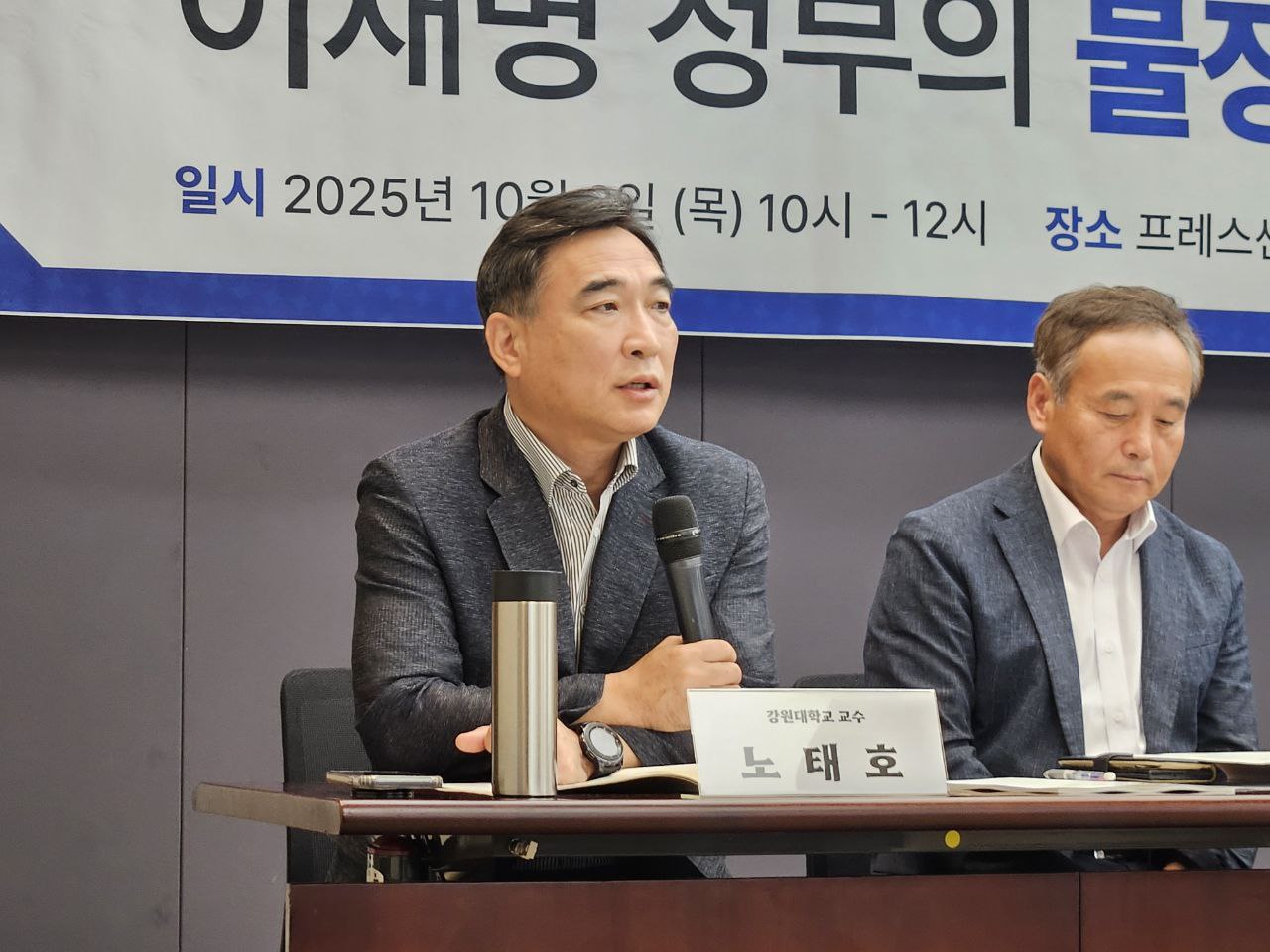 김홍상 농정연구센터 이사장의 주재로 시작된 지정토론의 첫 번째 순서로 발언한 노태호 강원대학교 교수는 이재명 정부의 국정과제 내용에 대한 토론을 이어갔다. 국정기획위원회에서 전문위원으로 참여한 노태호 교수는 발언자는 국정과제 44번(모두가 누리는 쾌적한 환경 구현)·45번(4대강 자연성 및 한반도 생물다양성 회복) 추진이 가속화되고 있다고 평가했다. 특히 취수구 인접(약 50m) 지점으로 수질 측정 위치를 조정하는 등 국정기획위 제안과 유사한 개선이 진행 중이며, 시민사회가 우려한 취·양수장 개선 요구도 정책 설계에 반영되도록 노력했다고 설명했다.