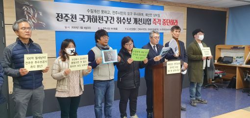 이에 전북환경운동연합은 다른 환경단체 세 곳과 연합하여 3월 4일 긴급하게 기자회견을 진행했다. 취수보 개선 사업이 ‘수질개선을 못하고, 전주시민의 요구를 무시하며, 예산만 낭비할 사업’이기 때문에 공사를 일단 중단하고 사업 내용을 전면 수정해야 한다고 주장했다.