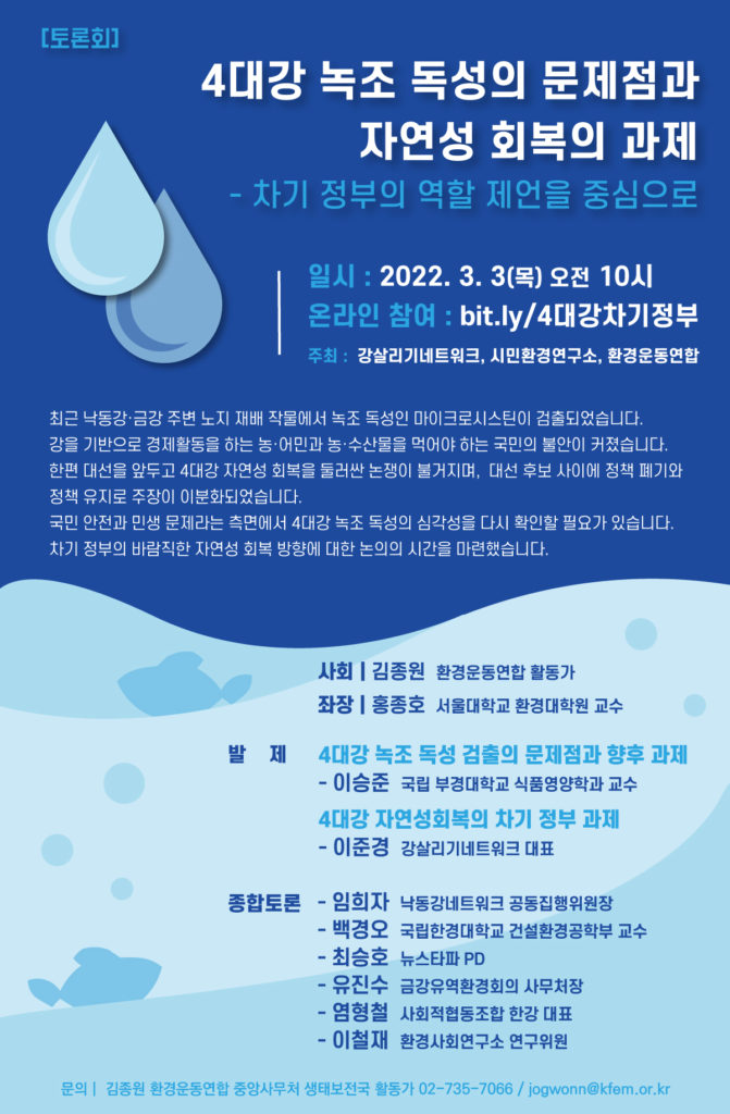 최근 시민사회, 국회, 언론이 공동으로 낙동강금강 주변 노지 재배 작물에서의 마이크로시스틴 검출 결과를 발표함. 이후 강을 기반으로 경제활동을 하는 농·어민과 그 농·수산물을 먹어야 하는 국민의 불안이 커짐.