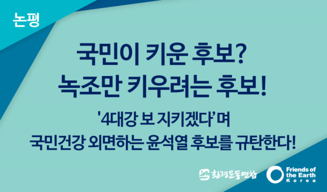 ○ 윤석열 후보는 지난 2일 3차 대선 후보 토론에서 마지막 발언으로 “국민이 안전한 나라, 상식의 승리”를 강조했다. 하지만 국민 먹거리 안전을 외면하는 대통령 후보는 우리의 상식에 없다. ‘국민이 키웠다’라는 윤석열 후보의 선거 구호와는 달리, 4대강과 관련된 윤석열 후보의 발언은 ‘녹조를 키웠다’ 라는 말이 차라리 어울린다. 진정 국민을 생각하는 대통령 후보라면, 국민의 건강과 깨끗한 자연을 위해 4대강 재자연화에 목소리를 높여야 할 것이다.