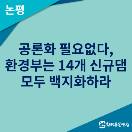 9월 29일, 환경부는 지난 정부가 추진한 신규댐 14개 중 수입천·단양천·옥천·동복천·산기천·운문천·용두천 등 7개 사업을 전면 중단한다고 발표했다. 나머지 지천·감천·아미천·가례천·고현천·회야강·병영천 등 7개는 기본구상 수립과 공론화를 거쳐 최종 추진 여부를 결정하겠다고 했다. 환경운동연합은 주민 반대가 지속되고 필요성이 입증되지 않은 사업들이 ‘대안 검토’와 ‘공론화’ 명목으로 계속 남아 있는 데 강력히 규탄한다. 환경부는 14개 신규댐 모두 백지화하라.
