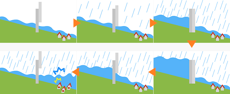 ▲ 홍수 조절 댐의 원리. 평시에는 수문을 열어놓았다가 비가 오면 수문을 닫고 댐 상류에 물을 가둬 하류로 흘러가는 물의 양을 조절해 홍수를 예방한다. 그러나 댐 수위가 가득찰 만큼 비가 많이 오면 댐 붕괴를 막기 위해 수문을 열어야하고, 이로 인해 오히려 홍수피해가 발생하기도 한다 ⓒ환경운동연합