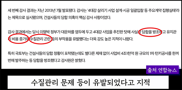 실제 2013년 진행되었던 감사원의 감사결과, 이명박정부가 대운하를 고려해 4대강사업을 추진하는 바람에 건설사들의 입찰 담합과 관리비용 증가, 수질관리 문제 등이 유발되었다고 지적되었습니다.