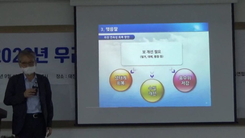 다섯 번째 토론자인 김경철 부산 도시환경연구소 이사는 4대강 보 얘기를 시작으로 제 기능을 못하는 존재 목적이 사라진 보와 댐들을 철거해야하며 자연을 회복하기 앞서, 무엇을 초점으로, 어느 방향으로 회복을 추진할 것인지 계획해 나가야 한다고 주장했다.