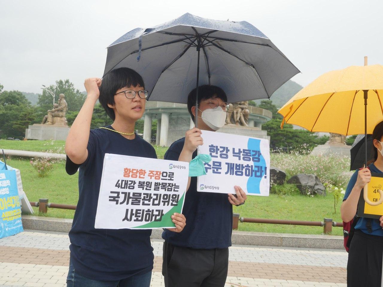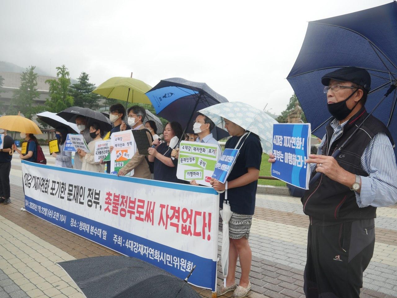 ○ 22일 4대강재자연화시민위원회는 청와대 분수대 앞에서 4대강 재자연화를 포기한 문재인 정부를 규탄하는 기자회견을 열었다. 이번 기자회견에서 4대강재자연화시민위원회는 지난 2017년 5월 22일 당시 대통령 지시사항으로 4대강 수문개방을 발표했지만, 한강과 낙동강 수문이 단 하나도 열리지 않았다고 강력하게 비판했다. 이들은 청와대와 환경부가 충분히 수문개방 권한을 행사할 수 있음에도 불구하고, 각종 위원회로 책임을 떠넘기고 있다며 금강과 영산강 보 처리방안 확정 및 한강과 낙동강의 전면적인 수문개방을 요구했다.