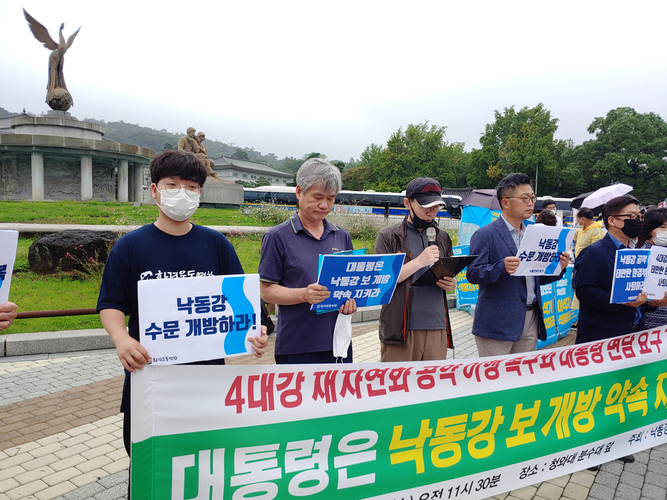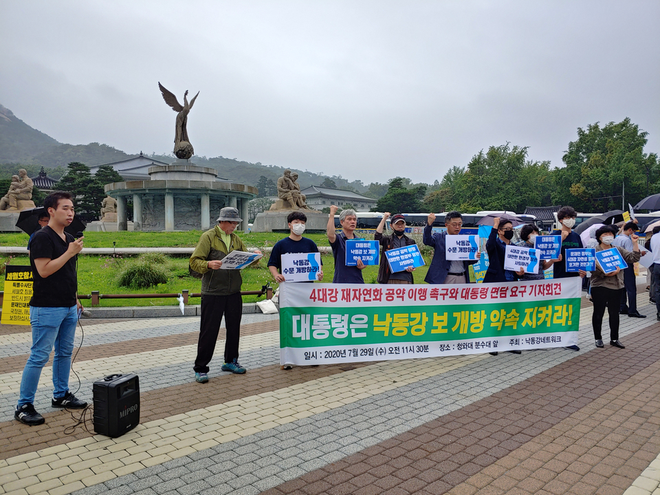 29일 오전, 낙동강네트워크는 청와대 앞에서 대통령 공약인 낙동강 보 수문개방을 통한 자연성 회복의 대책 마련을 촉구하는 기자회견을 개최했다. 이들은 기자회견문을 통해서 ▷문재인 자연성회복 정책의지 재천명, ▷낙동강 수문개방, ▷환경부 장관 경질 등을 요구했다.