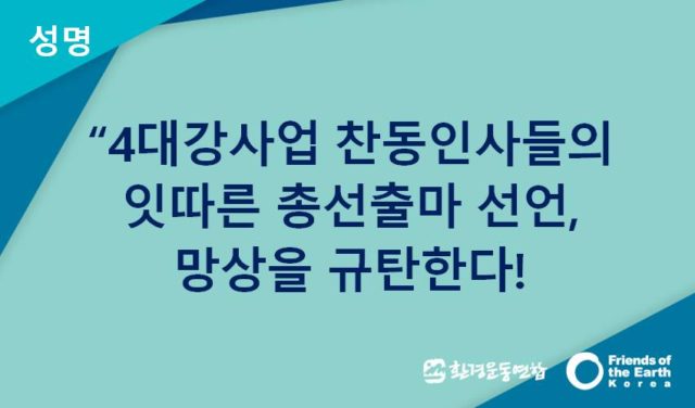 4대강사업은 멀쩡한 강을 파헤치고 흐르는 물을 인공보로 막아 회생불능으로 죽여 버린 적폐중의 적폐 사업이다. 국민은 혈세 22조원을 낭비하며 뭇 생명을 짓밟은, 대한민국 현대사의 부끄러운 조각으로 기억한다. 그런데 반성보다는 ‘진짜 환경’, ‘복원 반대’를 운운하고 있으니 부끄러움을 모르는 인사다. 우리는 4대강사업 찬동인사들의 잇따른 총선출마 선언과 망언들을 규탄한다. 진정 조금의 양심이 있다면 과오를 깨끗이 인정하고, 용서를 빌어야 할 것인데, 국회 등용을 위해 출마를 선언한 것은 또 다른 4대강사업을 준비하기 위한 포석으로 밖에 볼 수 없다.