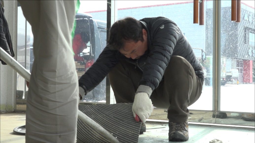 ▲ ‘금강 요정’으로 불리는 김종술 시민기자가 취재비를 마련하려고 타일 붙이는 아르바이트를 하는 모습. ⓒ 안정호